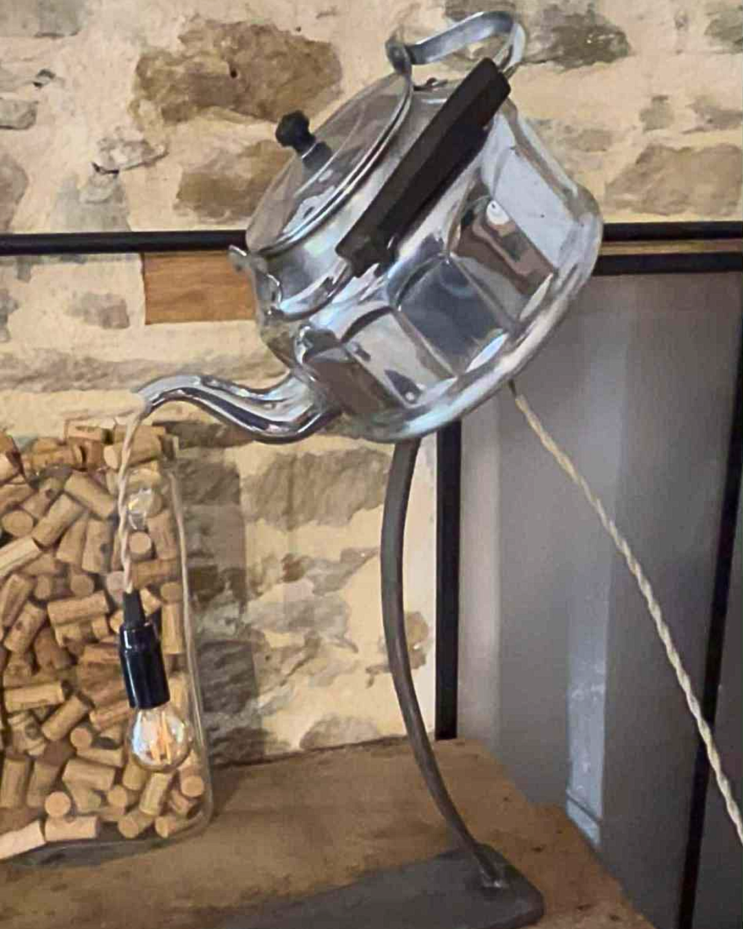 - Matériaux : ancienne bouilloire en fer blanc et pièces de métal de seconde main