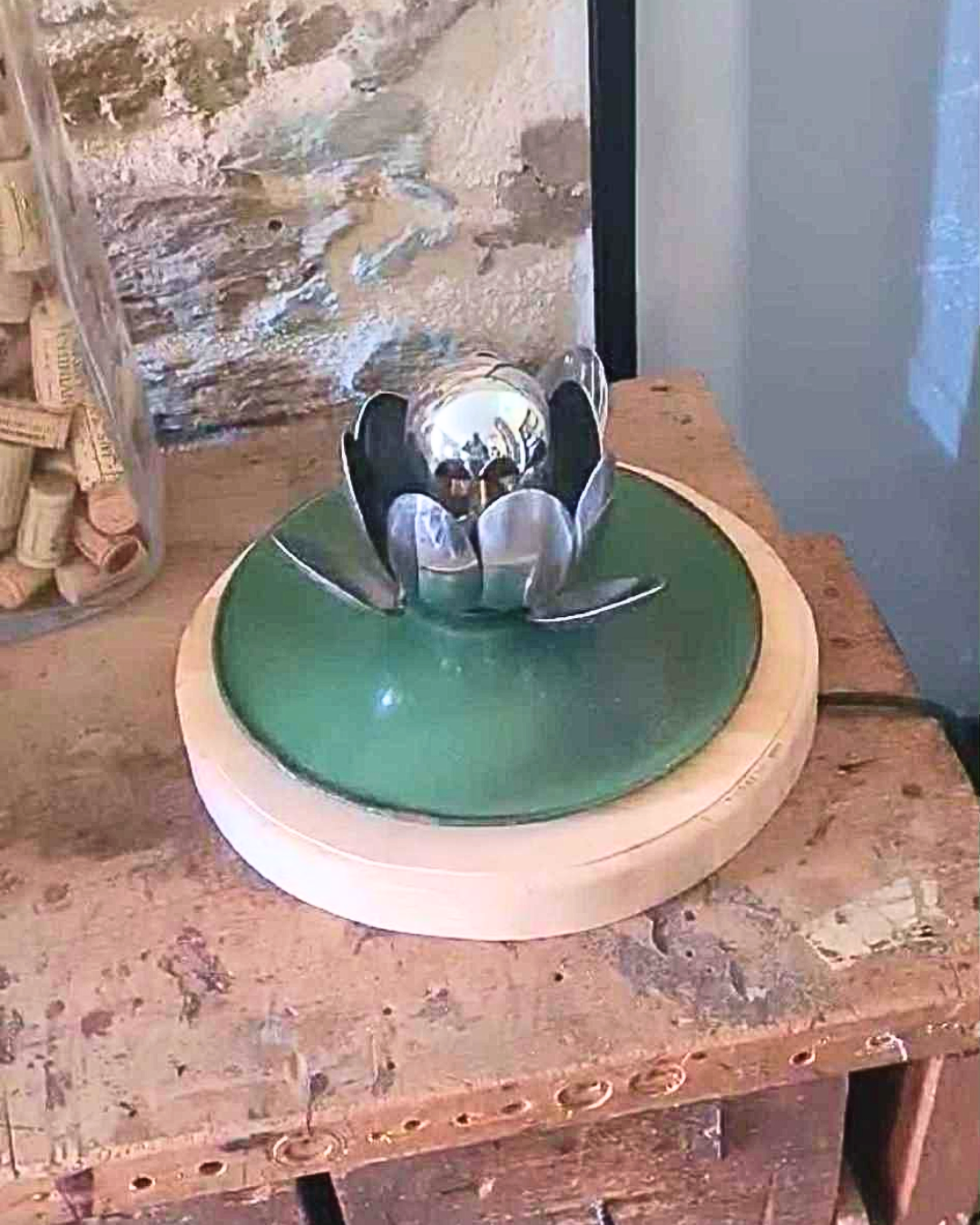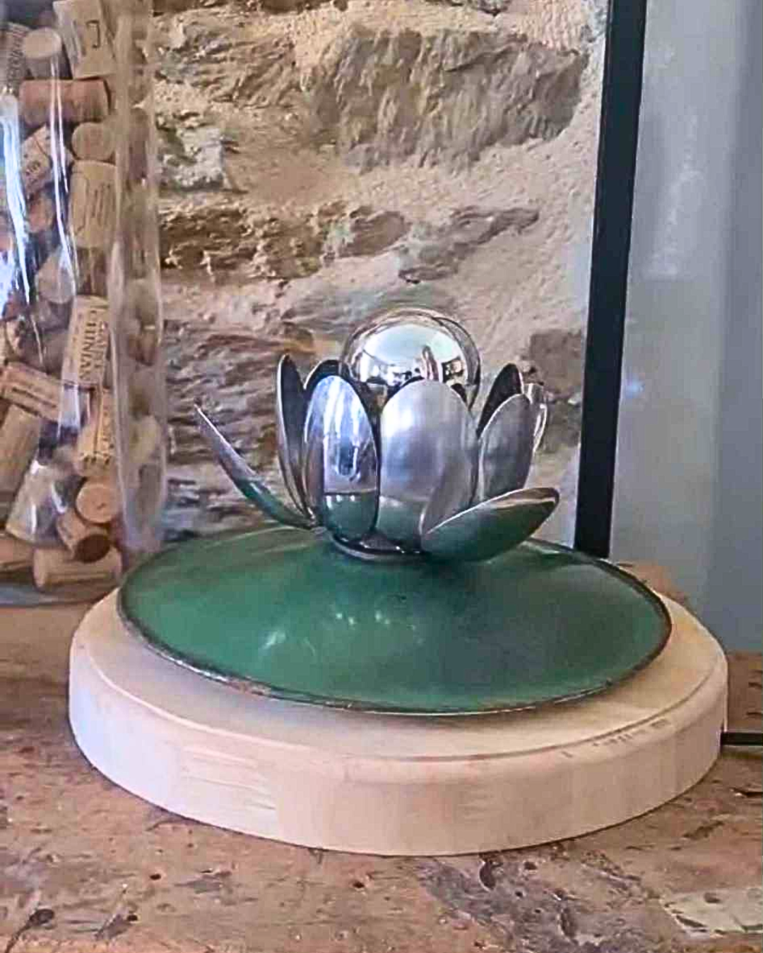 - Matériaux : cuillères à soupe, socle en bois (hévéa) et abat-jour industriel en émail vert