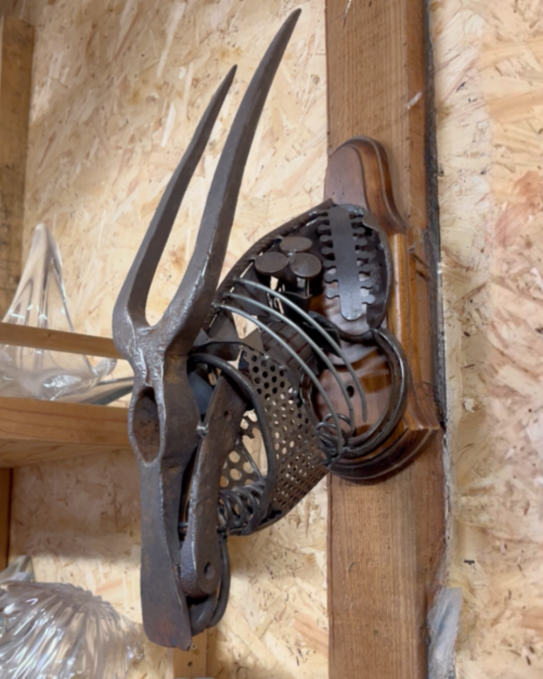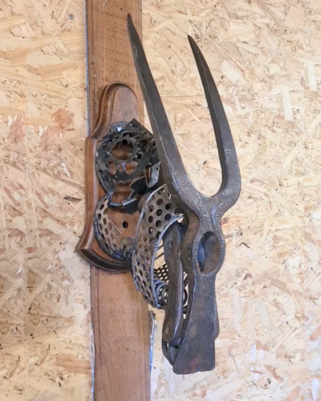 - Matériaux : applique en bois de seconde main, outils et pièces de métal de seconde main
