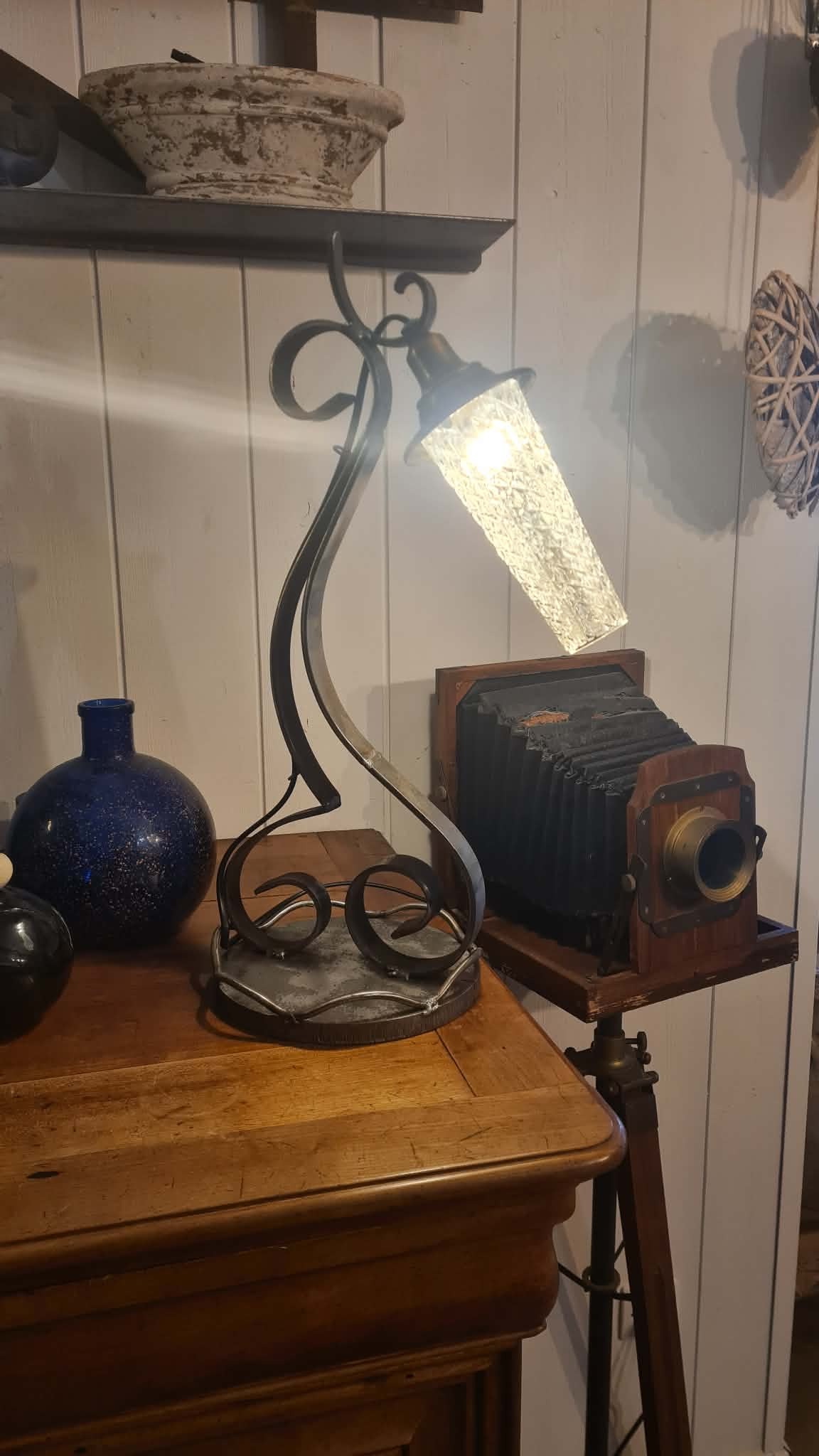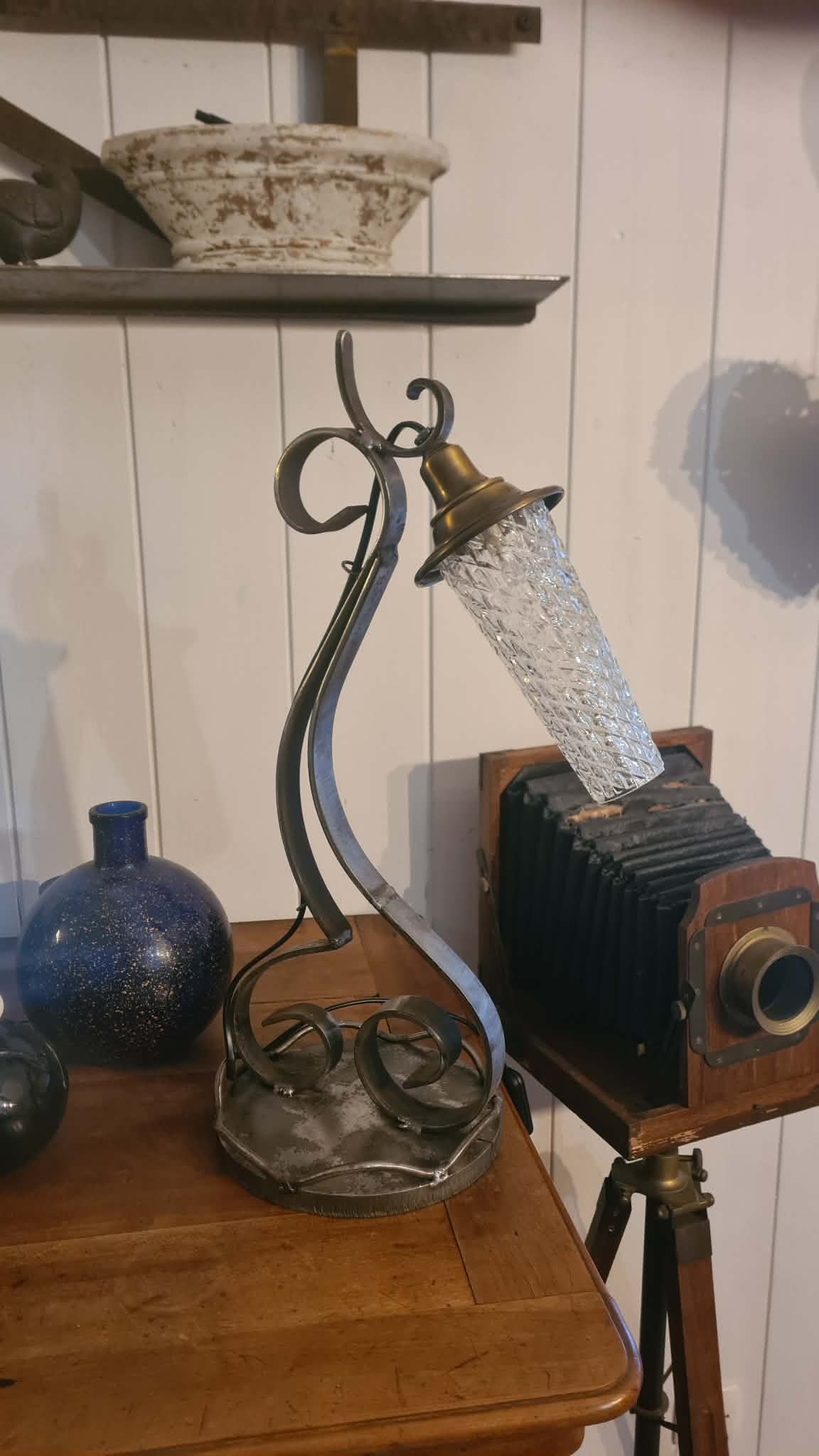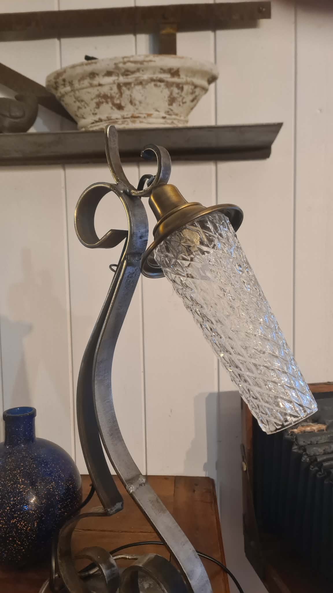 - Matériaux : verre ciselé, pièces de laiton, fer forgé