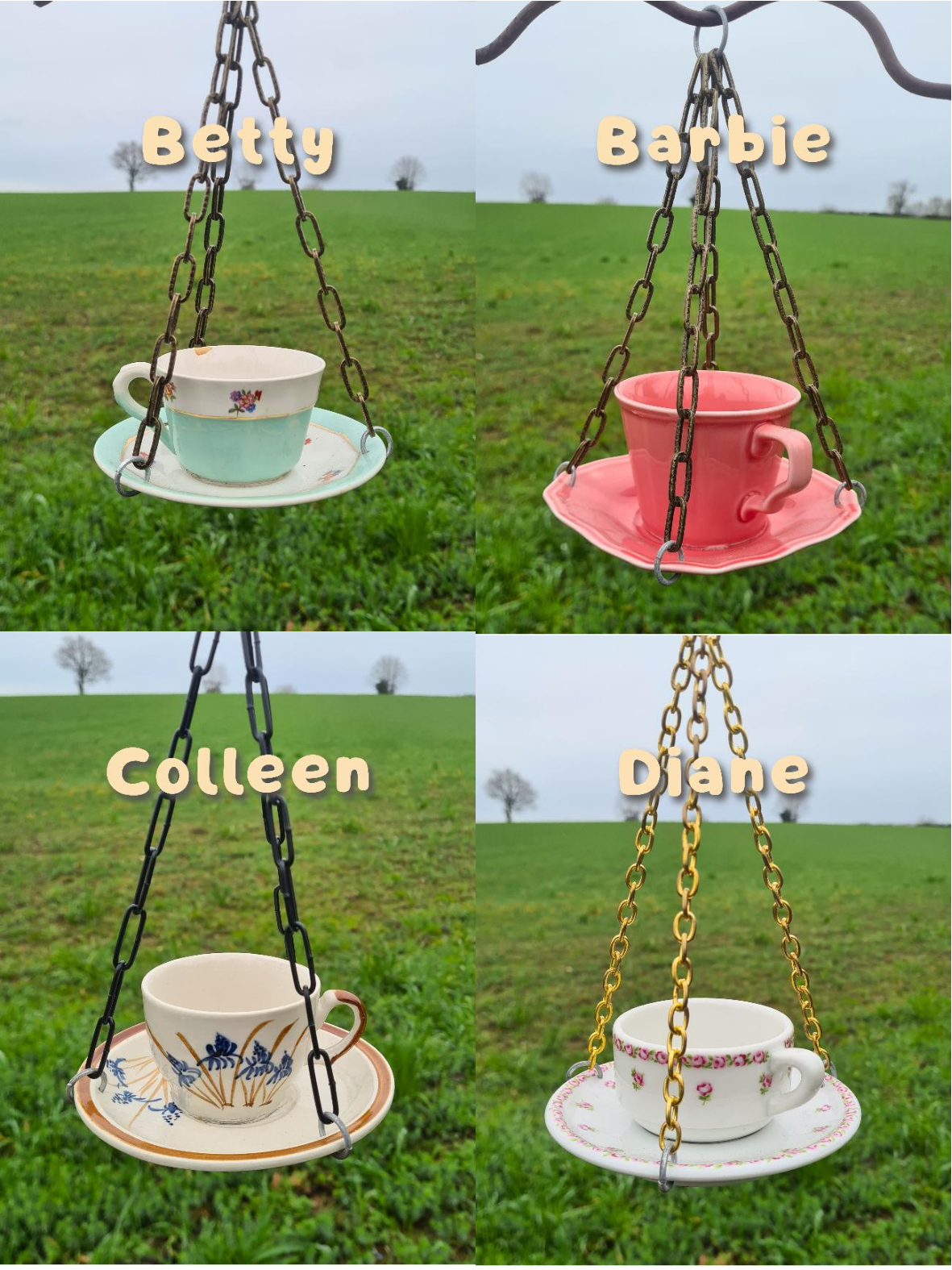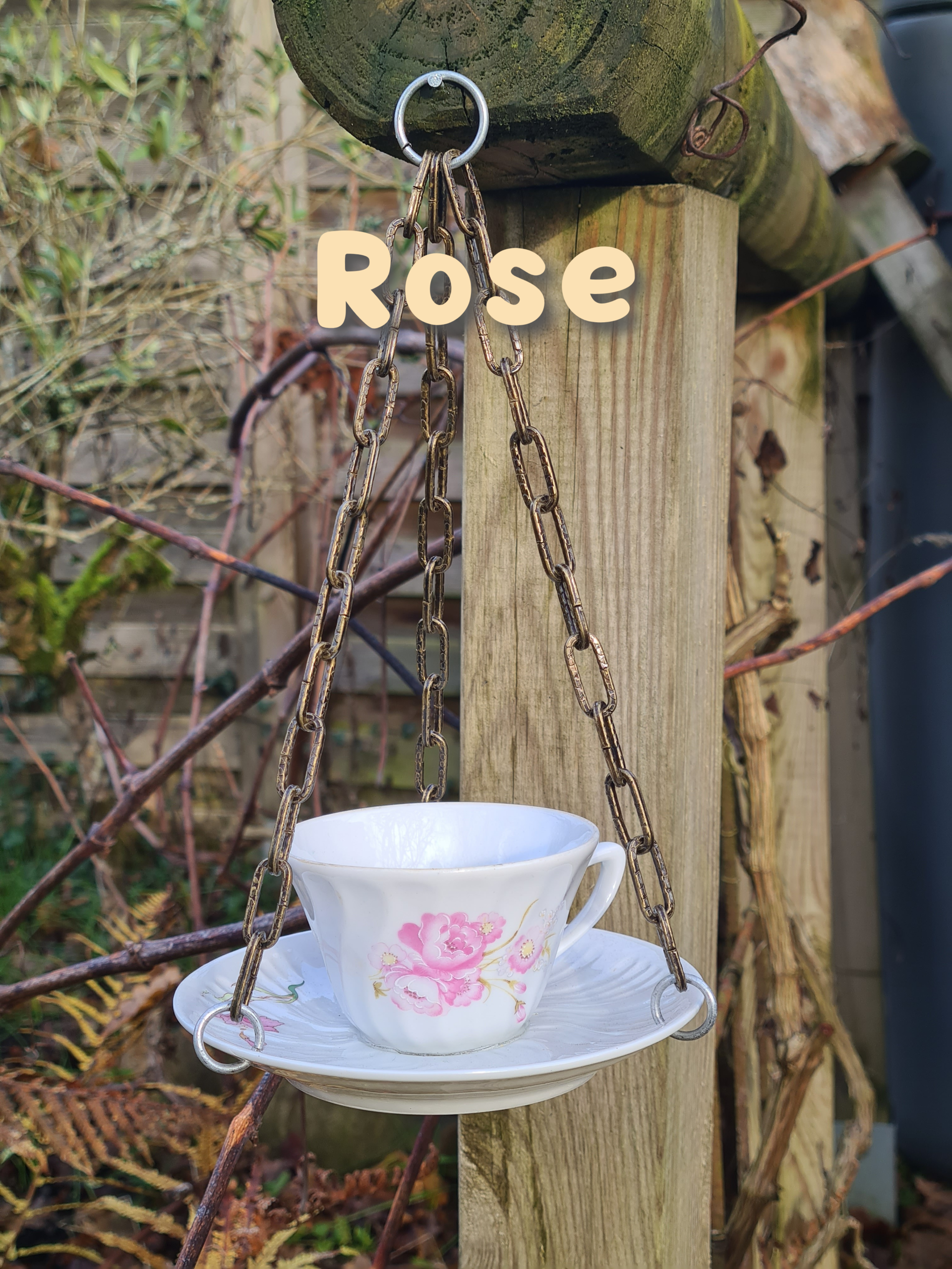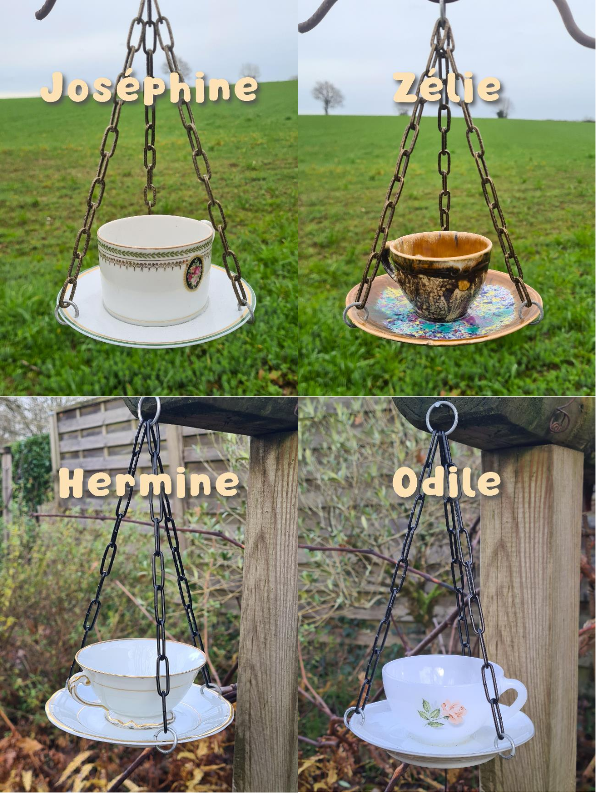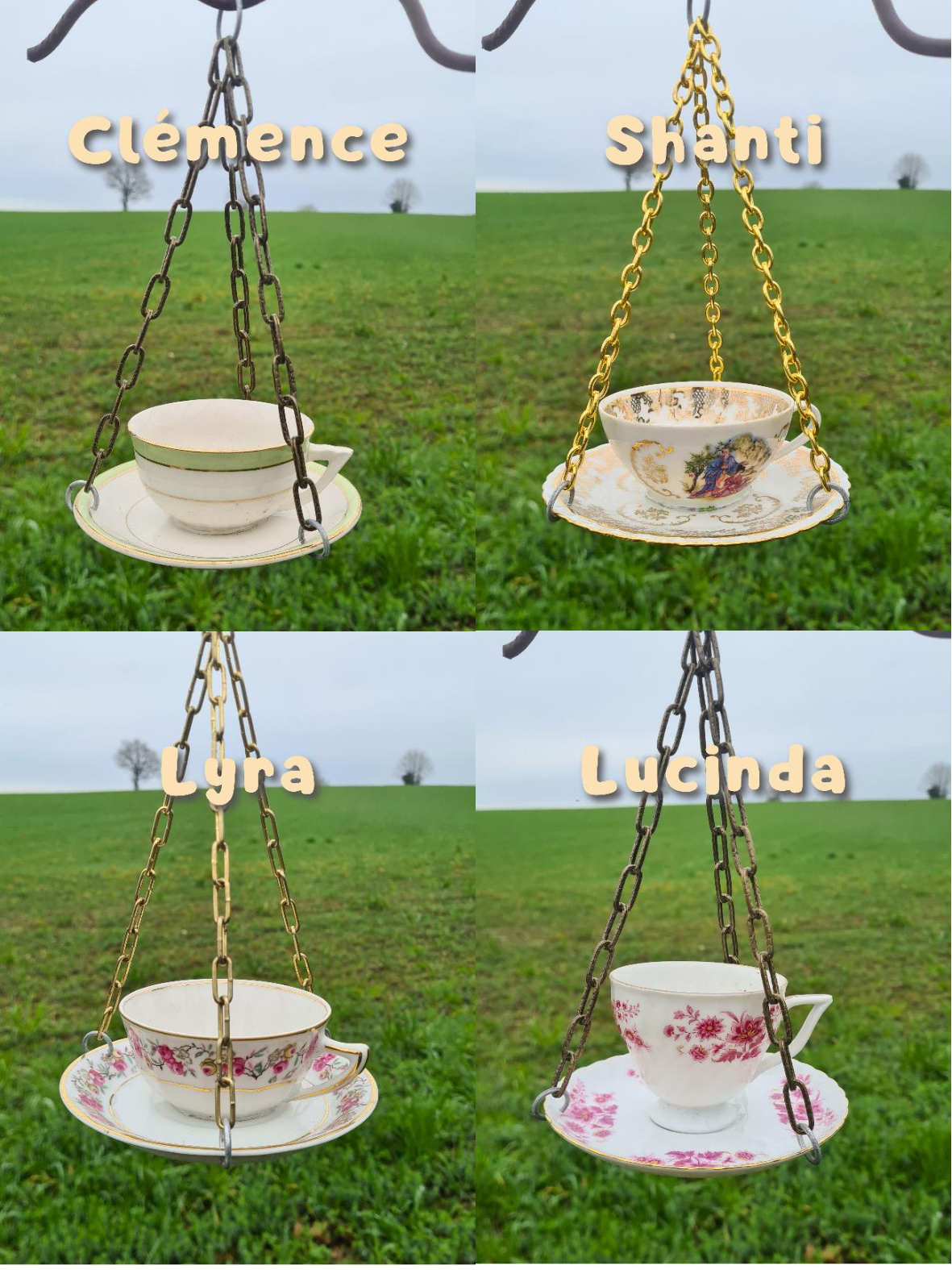 Matériaux upcyclés : tasses et soucoupes en céramique de seconde main, chaîne en acier