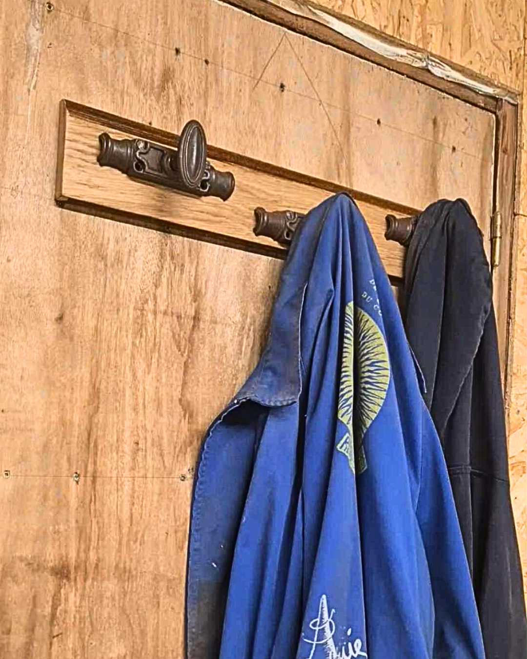 - Matériaux : planche en bois d’une maison en rénovation et trois anciennes crémones remises à neuf